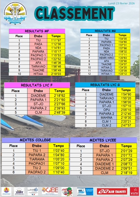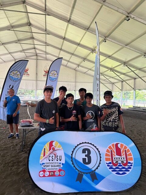 Le collège de Paopao a fait le déplacement avec détermination, engageant 6 équipages issus de l’AS Va’a. Au total, 26 rameurs et rameuses ont fièrement porté les couleurs de l’établissement, se mesurant aux grandes références du territoire, notamment les collèges de Papara et de Teva I Uta.