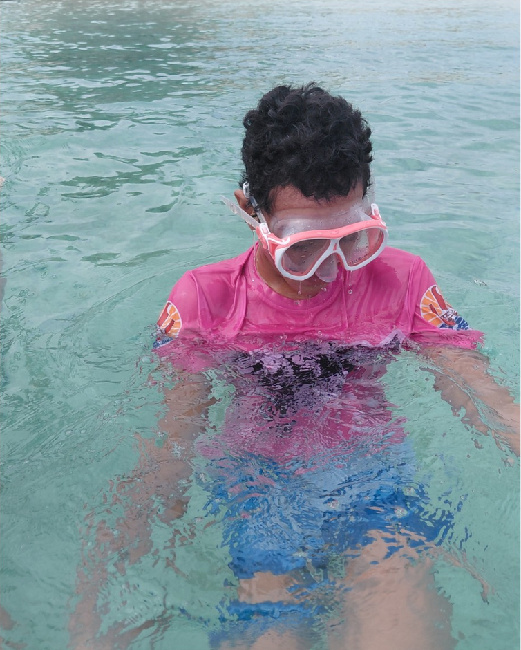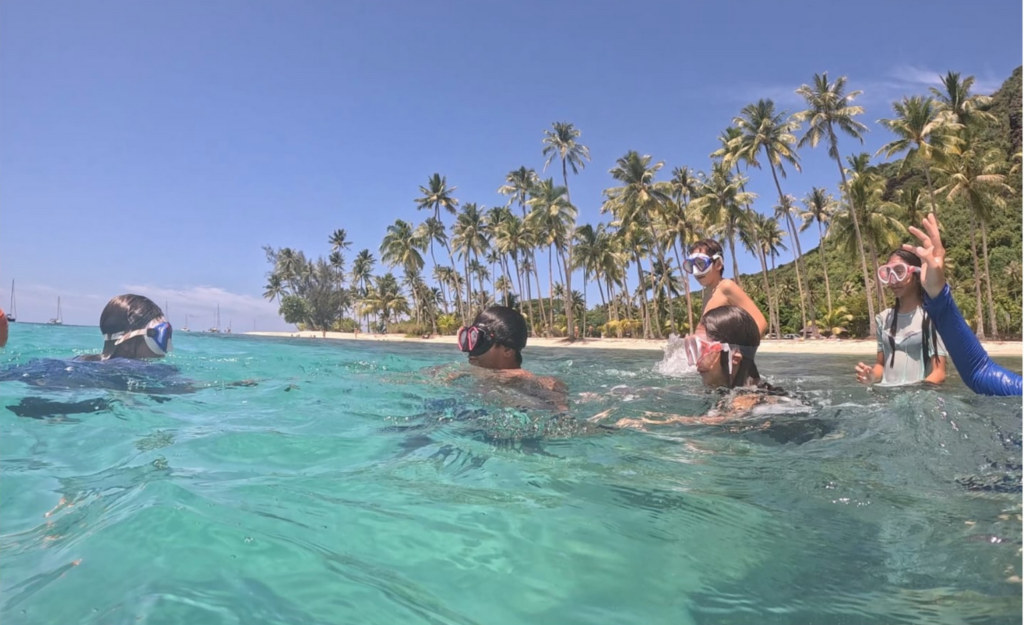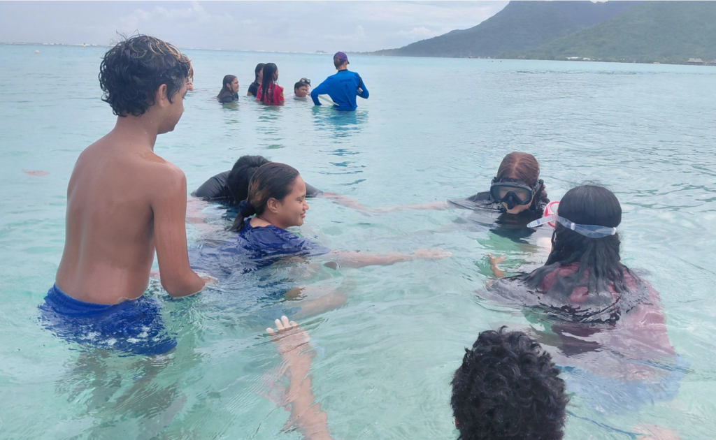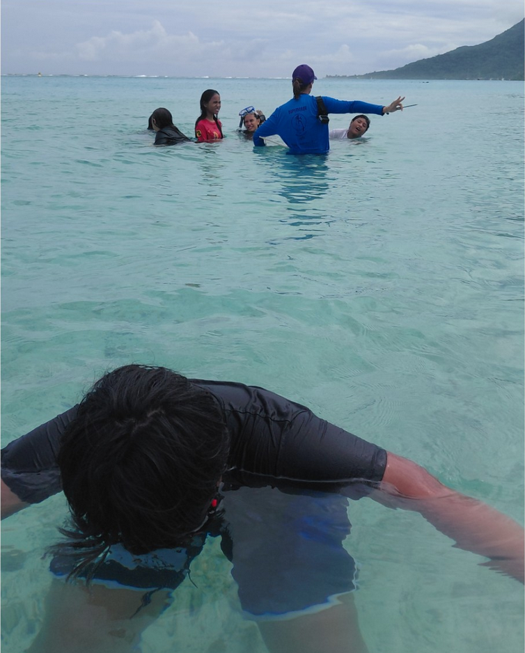 2/ Apnée à la plage de Temae avec une mer claire et calme. La 5ème2 était encadrée par les membres de To’a Hine Spearfishing. Les enfants ont fait de l’apnée statique et dynamique pour apprendre la gestion des efforts, le contrôle de soi et l’importance du binôme, ils sont allés explorer la riche faune et la flore du lagon et ils ont perfectionné leur technique en natation pure.