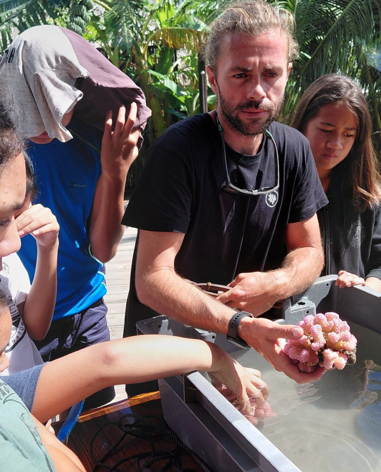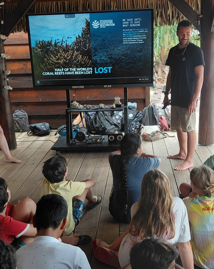 1/ Visite du site des Coral Gardeners avec présentation de leur travail et sensibilisation au récif corallien pour mieux le comprendre et le protéger. Ils ont fait des bouturages de coraux et manipulé les structures pour le replantage des boutures.